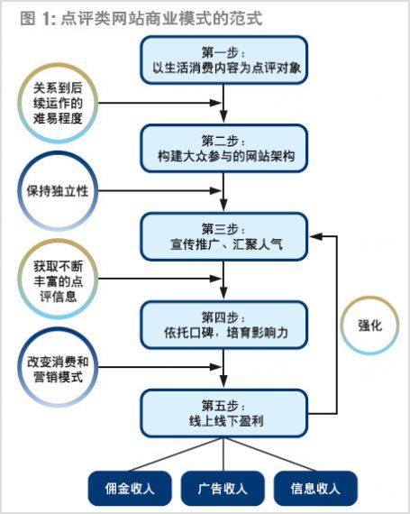 綜合對大眾點評網的剖析,可以發現點評類網站商業模式的范式,其經營軌跡可以分為五個基本步驟(如圖):第一步,確立以生活消費內容為點評對象,這直接關系到后續運作的難易程度;第二步,構建大眾參與的網站架構,樹立獨立形象,為網站的低成本運作奠定基礎;第三步,宣傳推廣,匯聚人氣,吸引用戶的點評,獲取不斷豐富的點評信息;第四步,網聚用戶點評,依托口碑的力量,通過改變消費和營銷模式,培育影響消費者和被點評對象所屬商戶的能力;第五步,線上線下盈利,并通過盈利,進一步加強網站的宣傳推廣,使其運作達到良性循環。