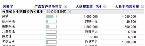 下面這個圖是GG關鍵字工具對“笑話”相關詞的搜索情況