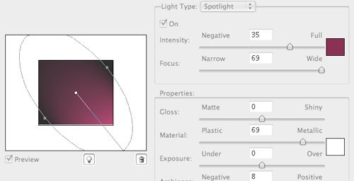 首先創(chuàng)建一個漂亮的背景。新建一個ps文檔,背景填充為黑色(D→Alt+Delete)。創(chuàng)建一個新圖層(Ctrl+Alt+Shift+N)并填充為白色(D→Ctrl+Delete)。下面將用“光照效果”濾鏡(濾鏡》渲染》光照效果)在這層上制作柔美的漸變效果。在強度調(diào)節(jié)旁邊,選擇你喜歡的任意顏色只要有一些深的顏色就可以。比如,我選擇了深粉色/紫色。