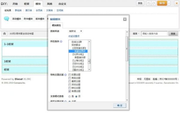 模板名:可以選擇不同的模板,標(biāo)準(zhǔn)版中內(nèi)置目前只有一套;如果有新模板可以將模板文件上傳到 template/default/portal目錄下,文件名必須為portal_topic_*.htm,*為自定義文件名,如果要重新選擇模板,請(qǐng)確保新模板與原模板中可拖拽區(qū)域具有相同的ID,否則將會(huì)丟失分部或全部原DIY數(shù)據(jù)