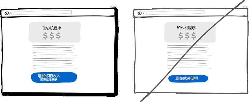 試想界面上有這樣兩個(gè)按鈕:一個(gè)是"獲取折扣",另一個(gè)是"立即注冊(cè)"。我敢打賭大多數(shù)人會(huì)點(diǎn)擊第一個(gè),因?yàn)榈诙€(gè)按扭讓人感覺不到有利可圖,并且"注冊(cè)"讓人聯(lián)想到填不完的表單。也就是說讓用戶感受到獲利的按鈕更有可能被點(diǎn)擊。這種讓用戶感到好處的文字信息也可是放在按鈕旁邊,不一定要做為按鈕的標(biāo)題。當(dāng)然,正常的按鈕還是有用處的,一般用于重復(fù)性操作頻繁的地方。